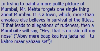 In trying to paint a more polite picture of Mumbai, Mr. Mehta forgets one single thing about Mumbai. It is a town, which, more than anyplace else believes in survival of the fittest. If that leads to allegations of rudeness, then a Mumbaite will say, "Hey, that is no skin off my nose" (