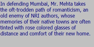 In defending Mumbai, Mr. Mehta takes the oft-trodden path of romanticism, an old enemy of NRI authors, whose memories of their native towns are often tinted with rose colored glasses of distance and comfort of their new home. As he compares New York with Mumbai, Mr. Mehta contends that: